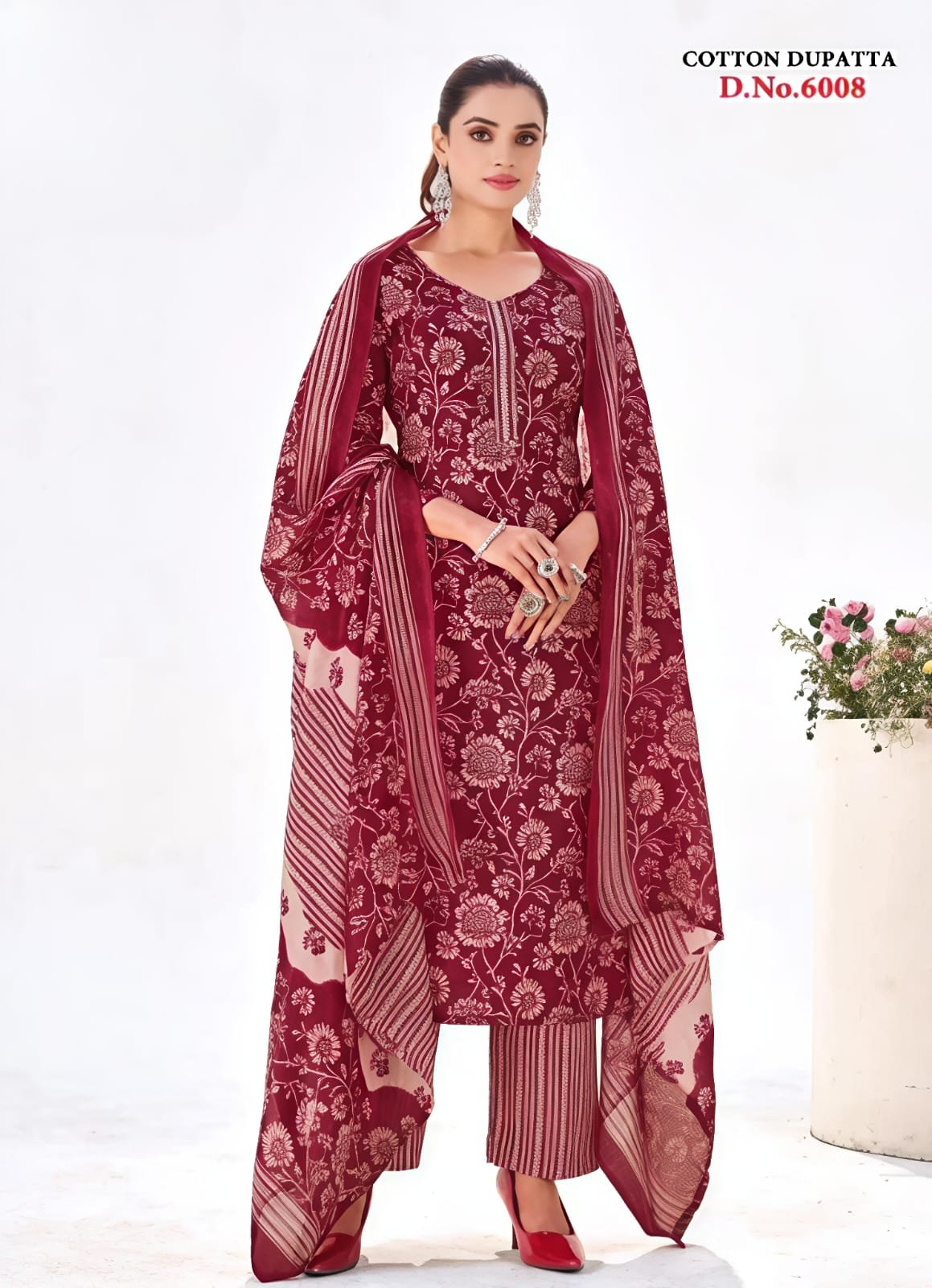 Ganeshji Nargis Vol 6 Cotton Printed Dress Material 6008 Top:- Cotton Printed | Cut:- 2.40 Mtrs | Bottom:- Cotton Printed | Cut:- 2.00 Mtrs | Dupatta:- Cotton Printed | Cut:- 2.10 Mtrs